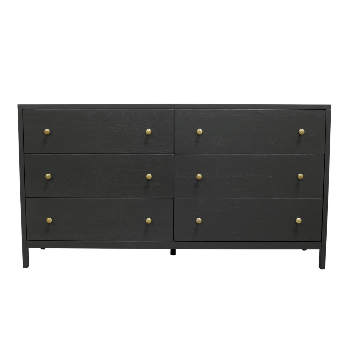 The Adley Dresser delivers effortless style and everyday functionality with a clean silhouette and understated character. Finished in a rich black tone, it showcases subtle wood texture throughout, adding depth and warmth to its simple design. Six spacious drawers offer ample storage, each accented with brass-finished knobs that bring a refined touch of contrast. Built for convenience, the Adley Dresser arrives fully assembled, allowing you to enjoy its timeless appeal the moment it’s in your space.