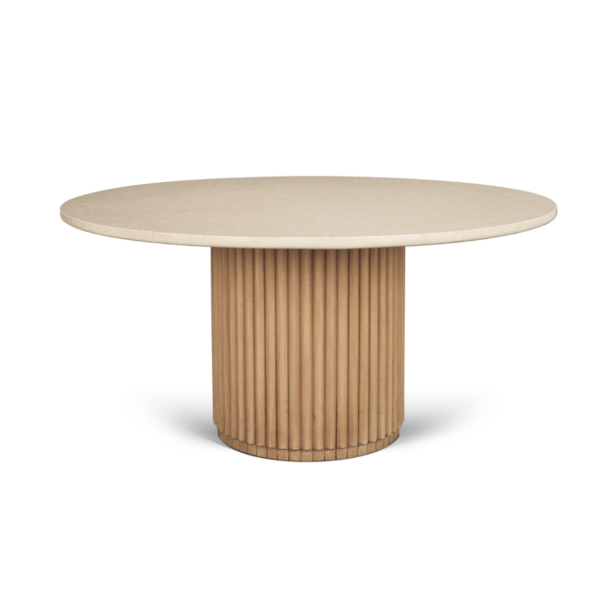 The Adrian Dining Table showcases a round Botticino cream marble top supported by a fluted light brown wood base with a recessed bottom, blending timeless tone with refined texture.