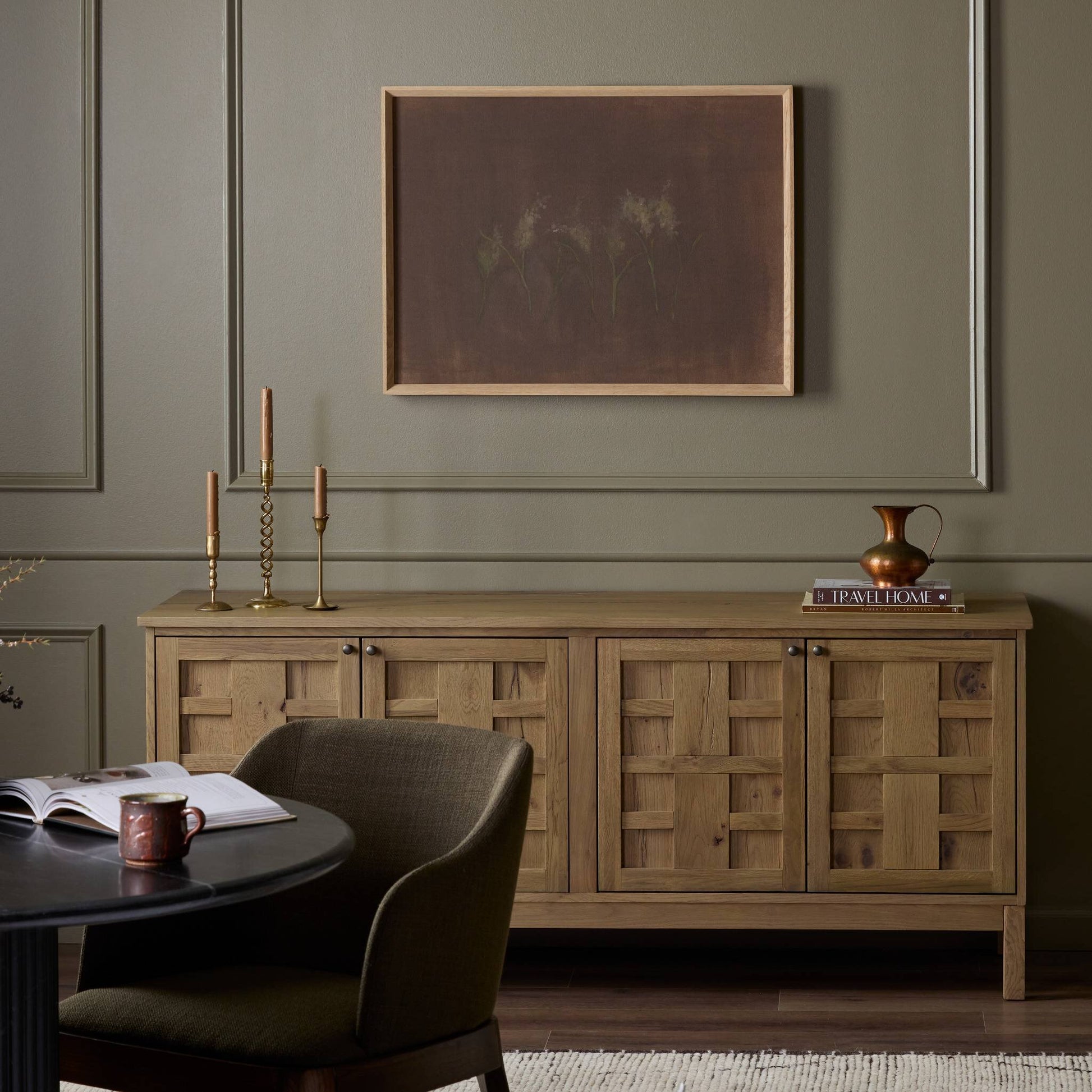 Moody and atmospheric, Bloom III by Brittney Schulz brings a quiet botanical presence to the wall. Softly rendered florals emerge from a richly layered, earthy backdrop, creating depth and subtle contrast. The horizontal composition and restrained palette give the piece a grounded, organic feel.