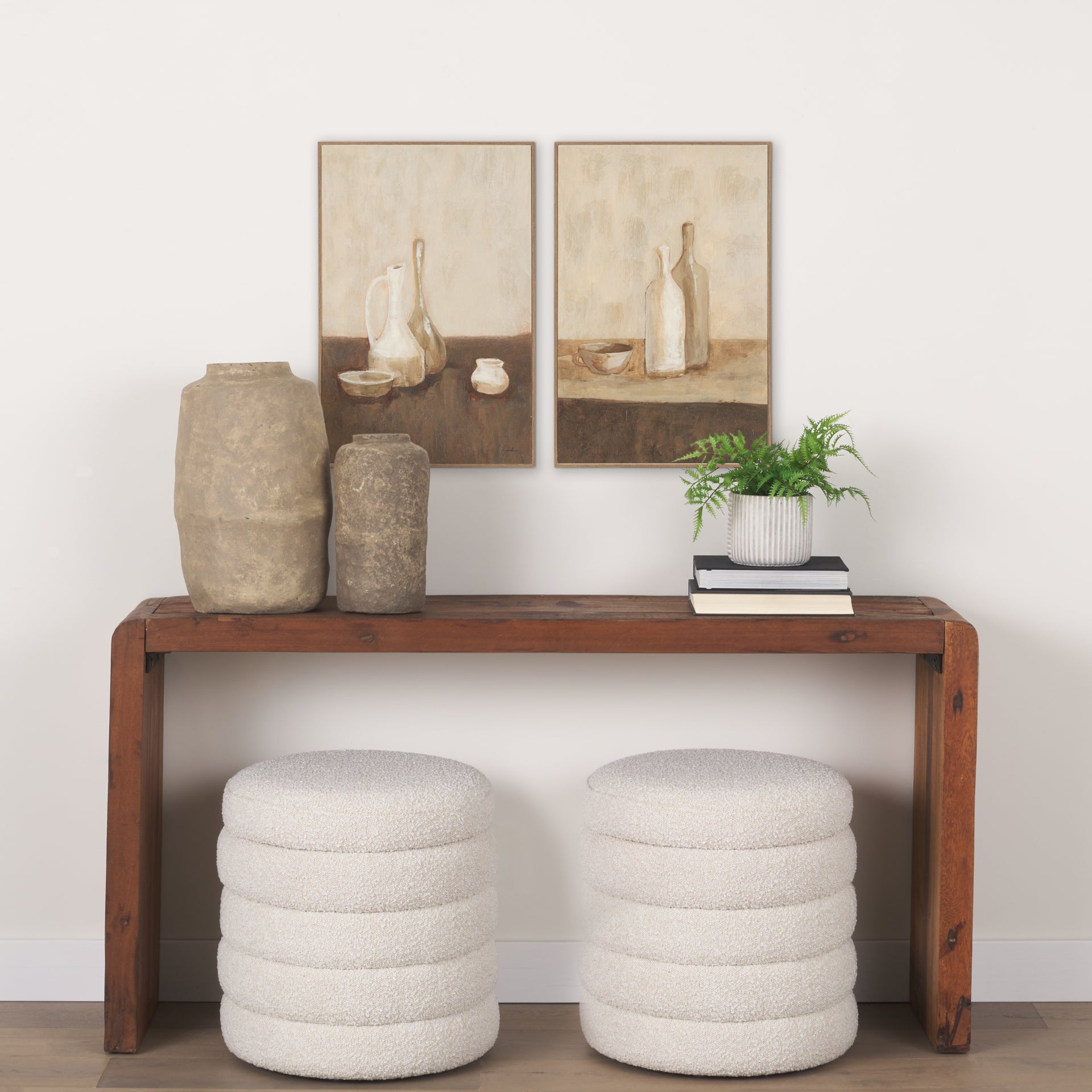 Bottled Perspective (Set of 2) is a captivating pair of hand-embellished artworks that celebrate the timeless beauty of still life. Rustic pottery and delicate bottles are brought to life through rich, earthy tones and textured brushstrokes, creating a sense of calm and simplicity. Each piece is matted under glass and framed in sleek natural wood, enhancing depth and visual interest.