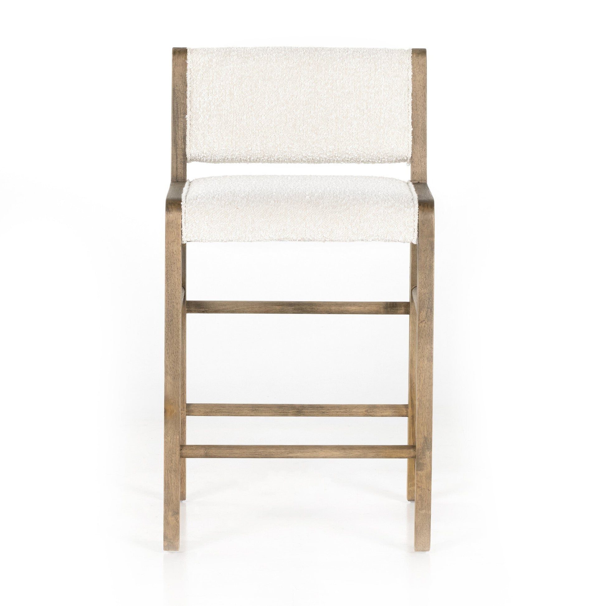 Make it modern with mixed materials. In a light, natural finish, solid parawood forms an angular frame for boucle-upholstered counter seating in a classic cream.