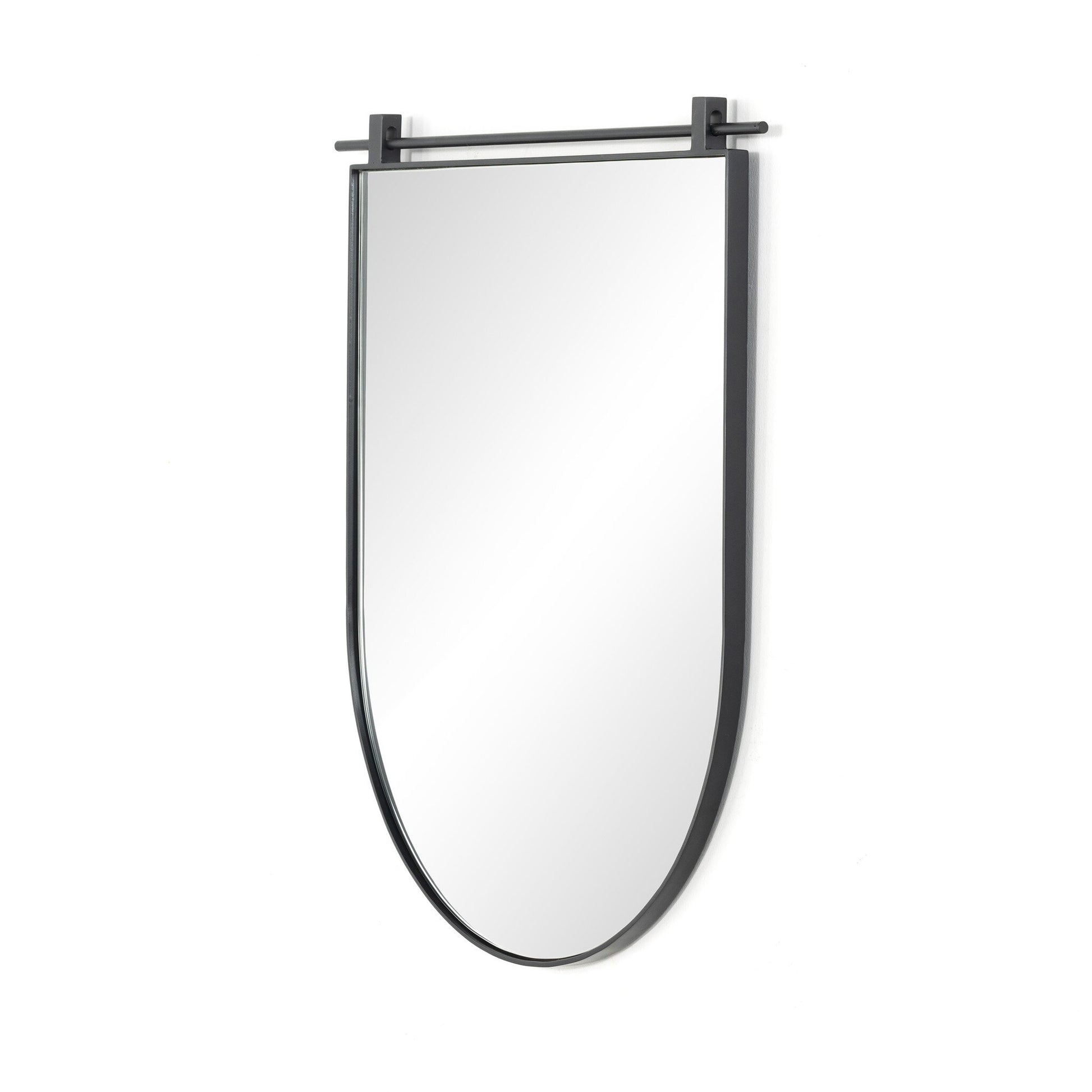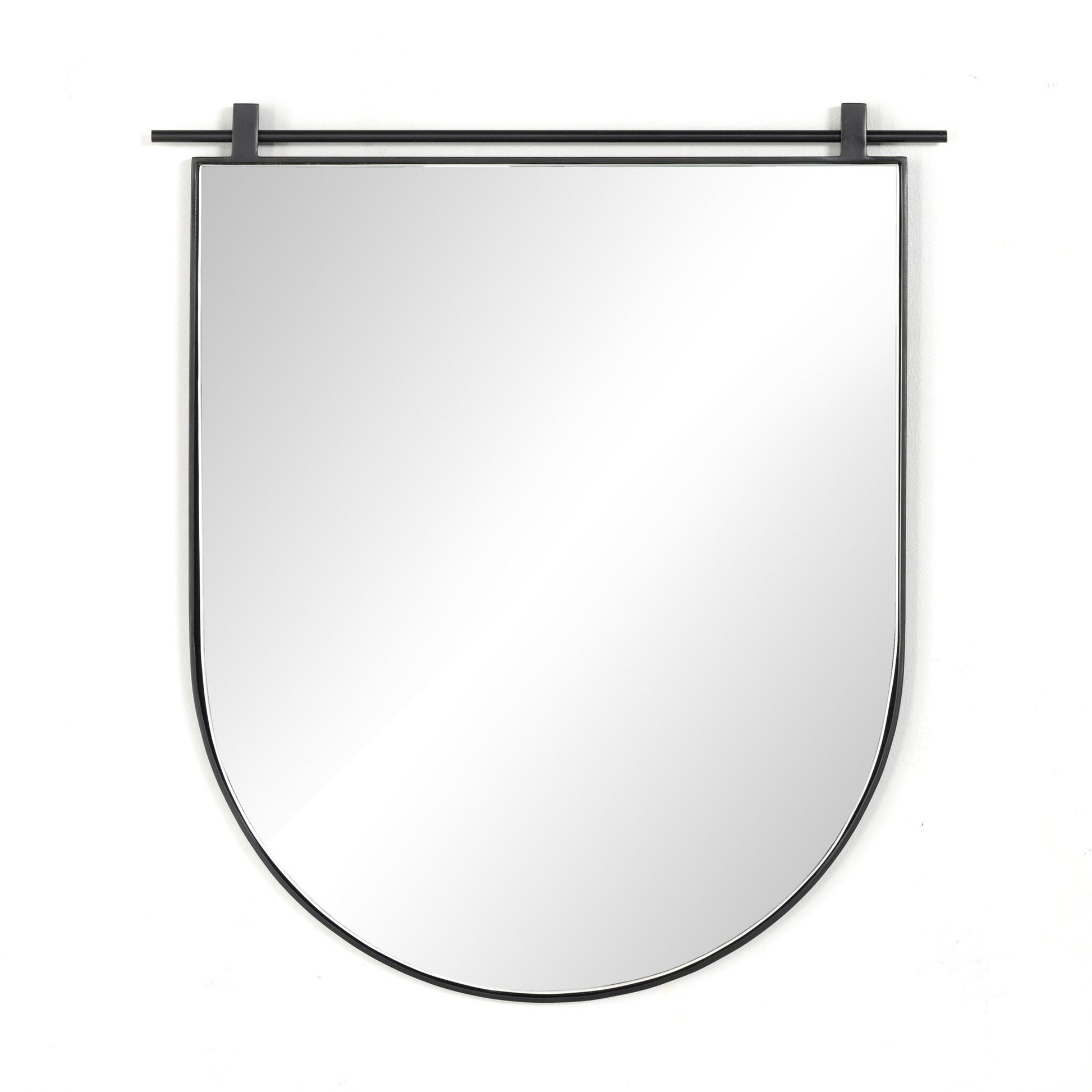 A slim antique iron bar suspends a simple arch for a streamlined, modern-minimalist look. Damp rated and designed to withstand moisture indoors, including bathrooms.