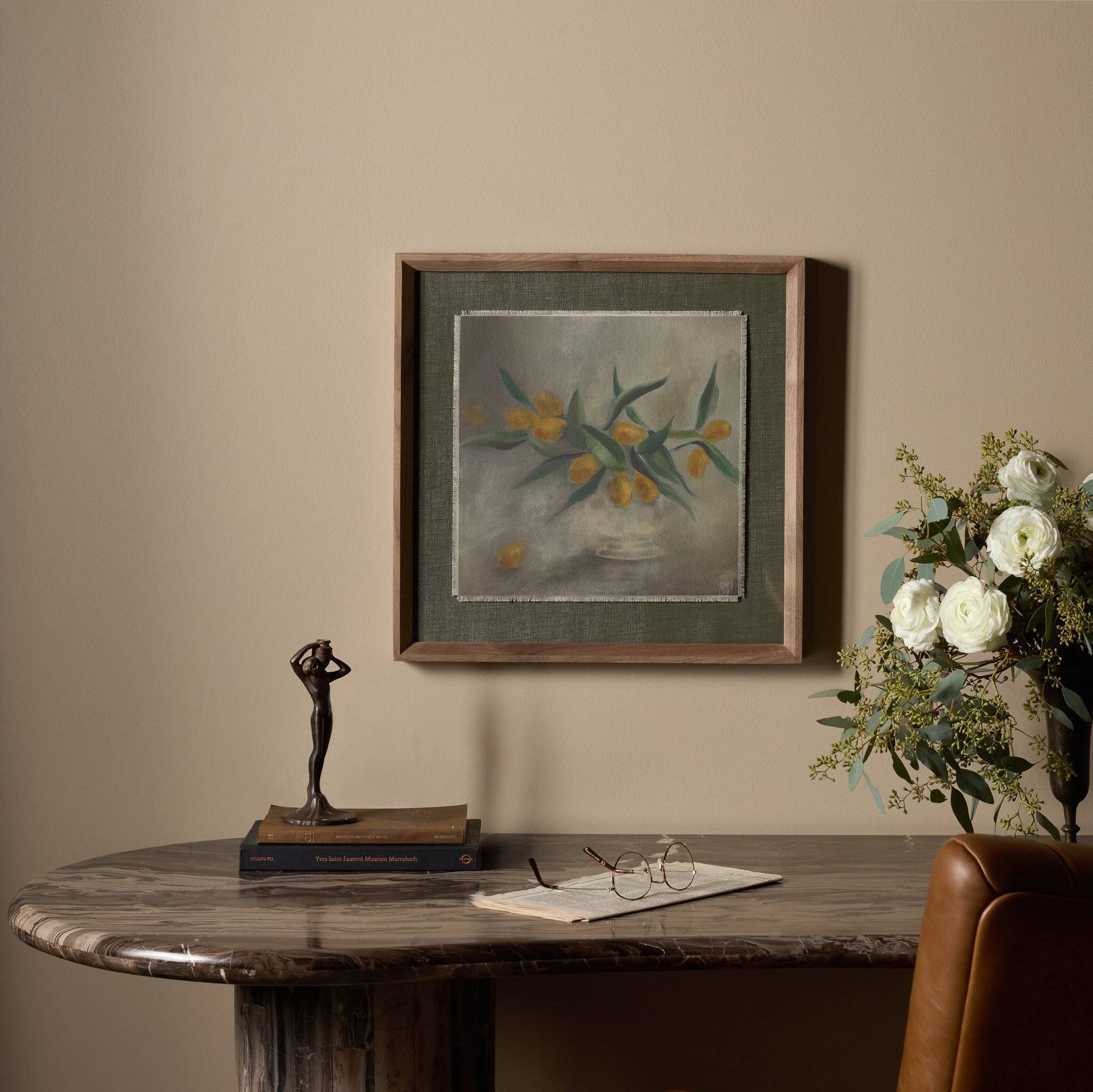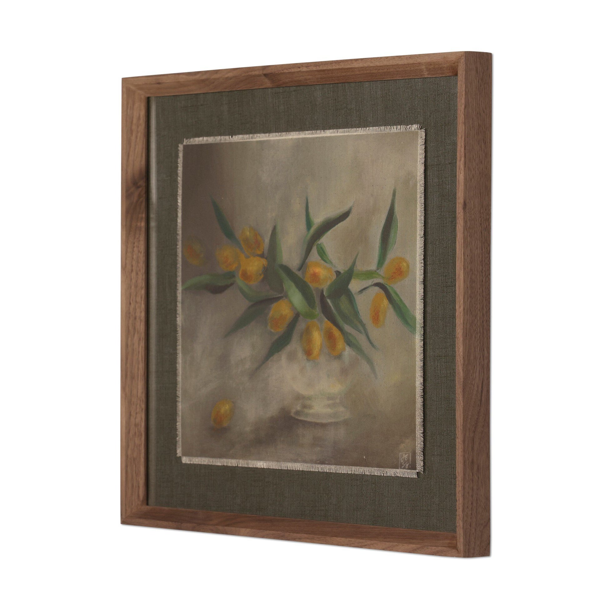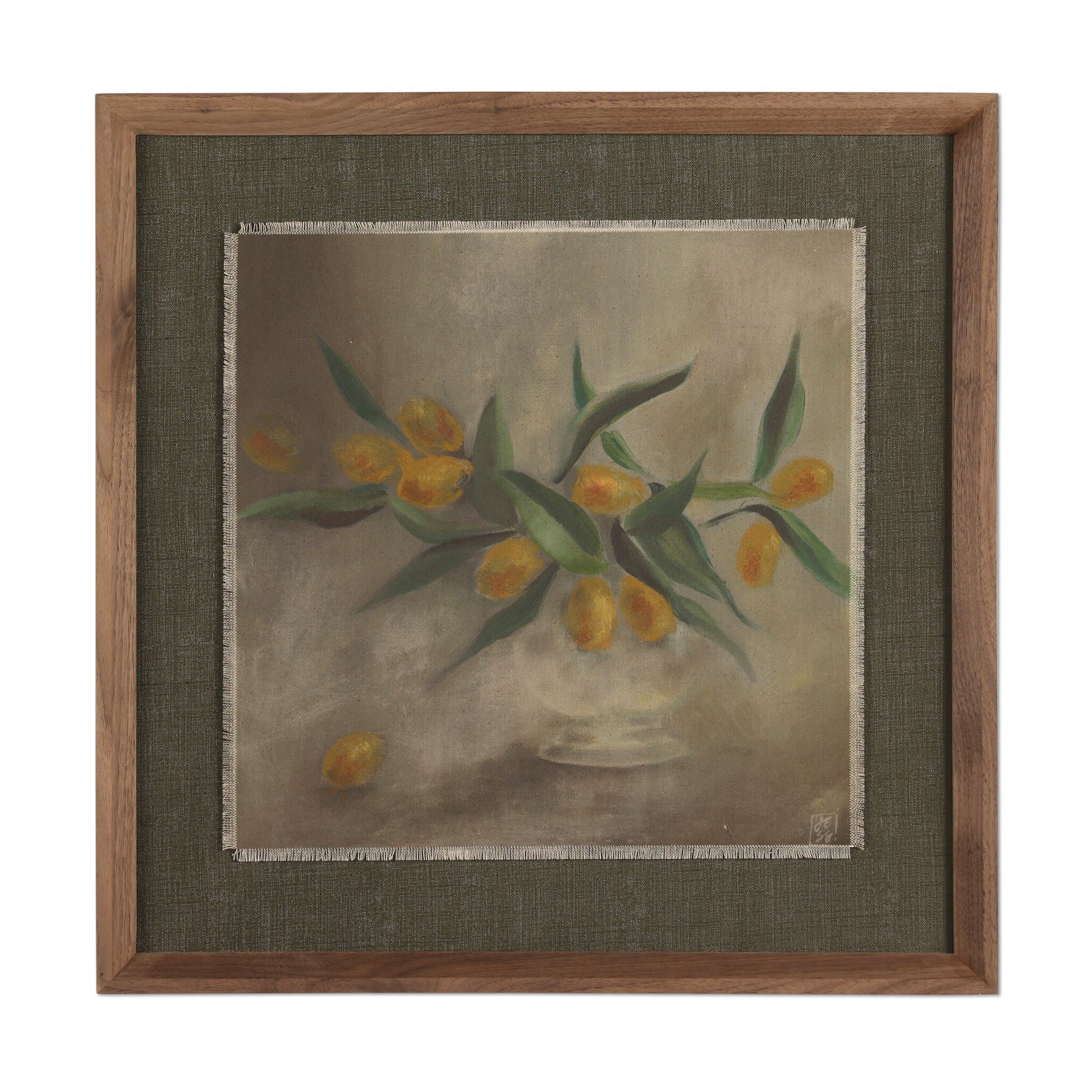 Austin-based artist Jess Engle taps nature and geometry for artistic inspiration. She utilizes a chiaroscuro painting technique to highlight colorful citrus cuttings against the calming grey environment, an interplay of subtle gradation, light and shadow. Handmade in Austin, Texas.