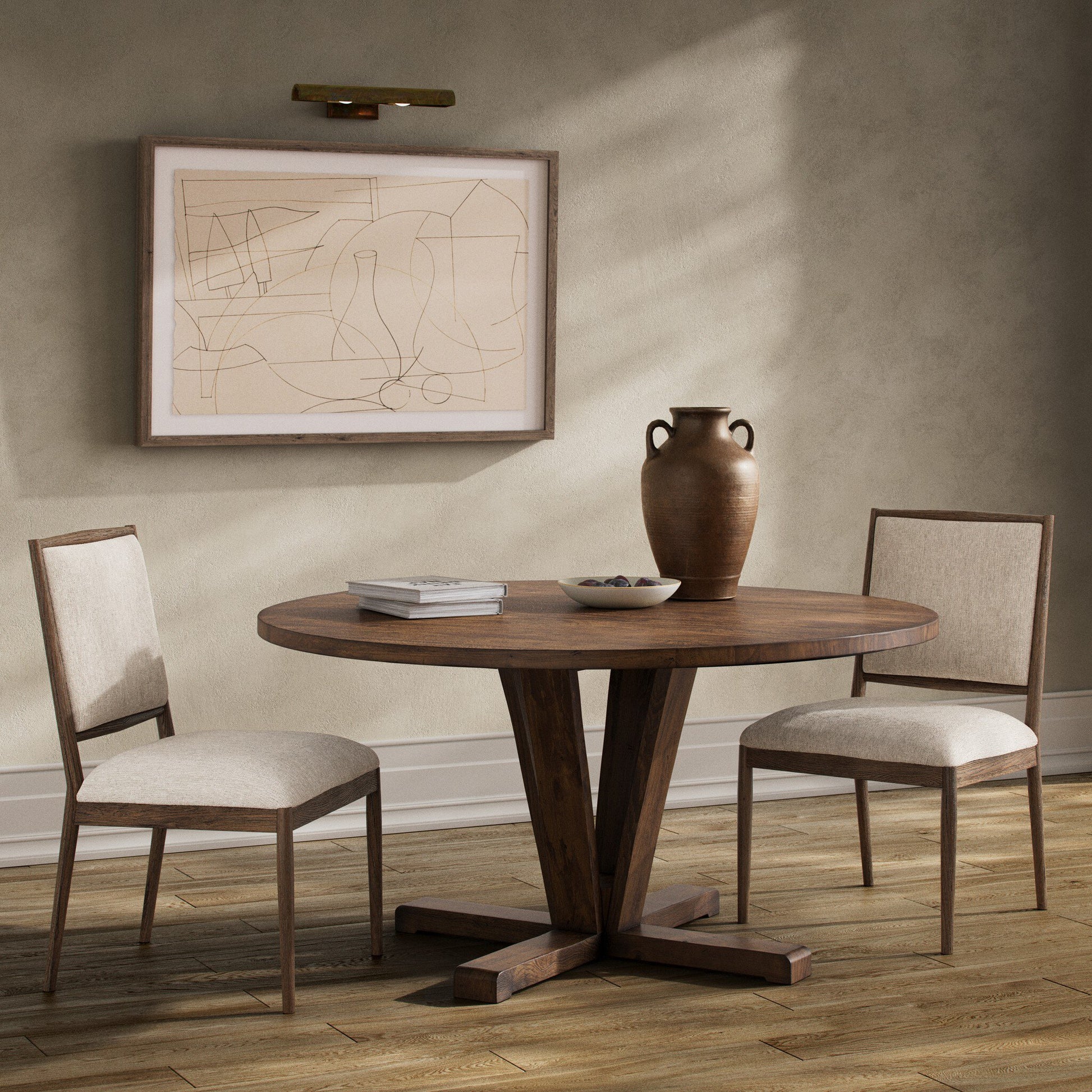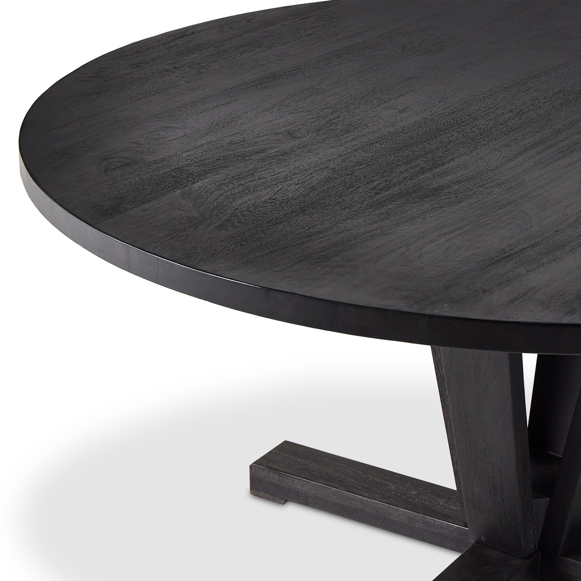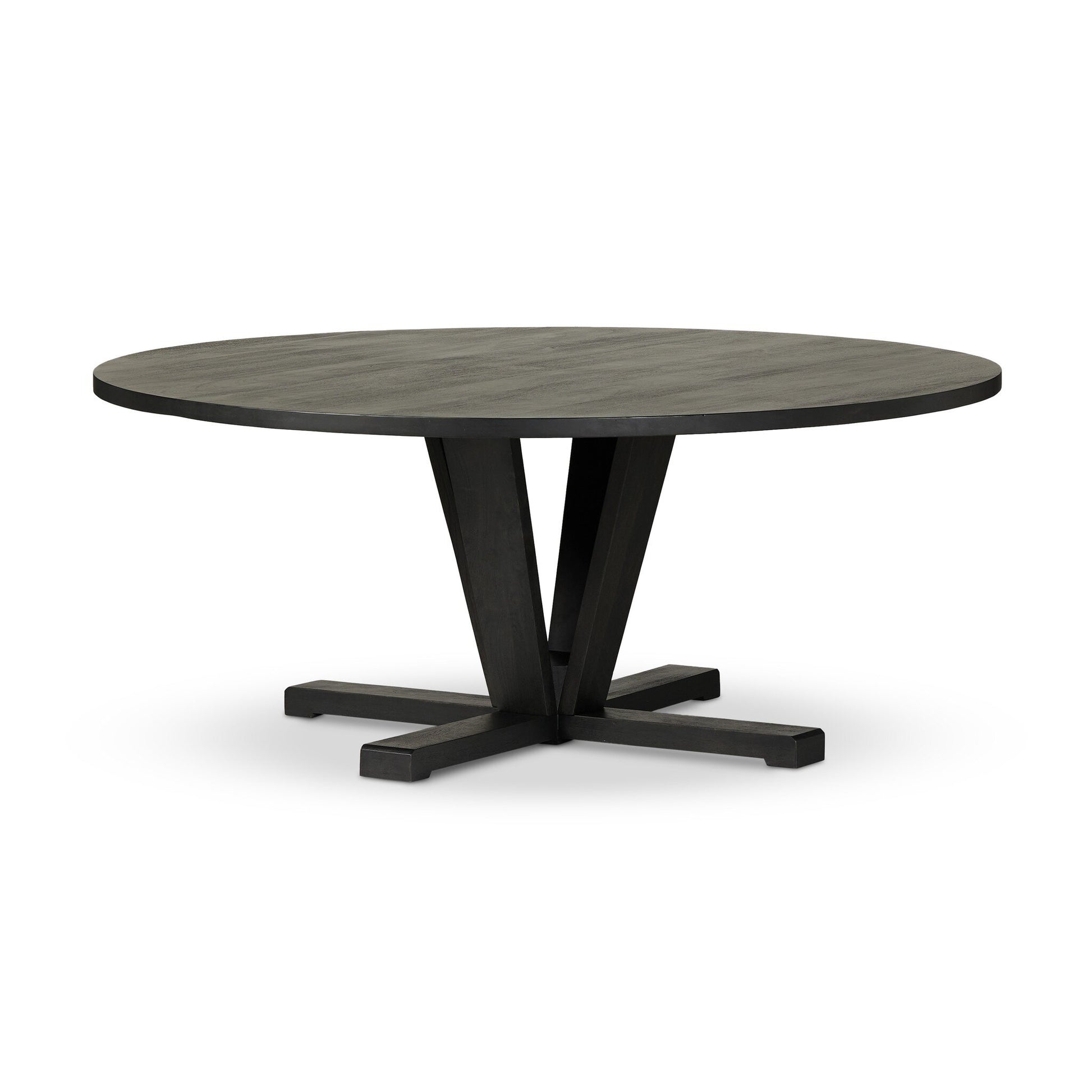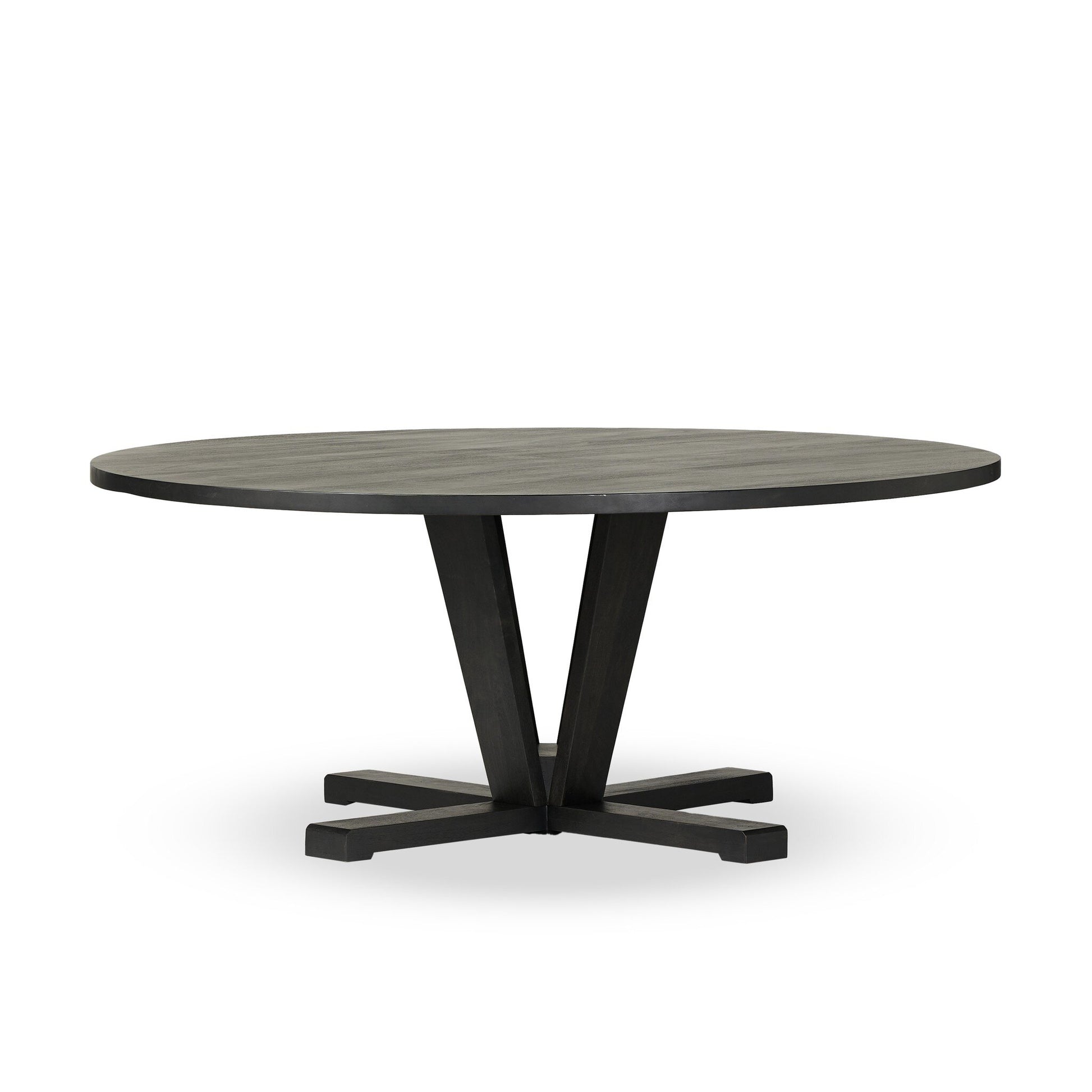 Available in Reclaimed Mango or Flint Black, and offered in 60-inch and 72-inch round sizes, this pedestal-style table brings timeless texture and sculptural presence to the dining space.