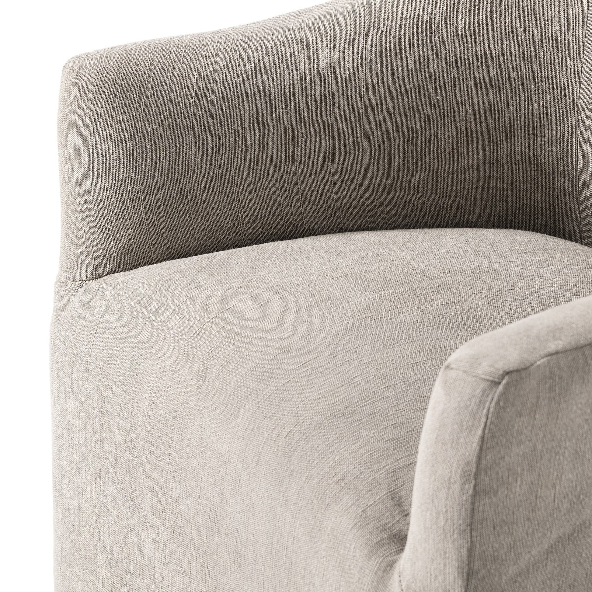 Refined and effortlessly functional, the Cove Dining Chair blends soft curves with tailored detailing. Its polished silhouette is fully upholstered in a heathered twill stone fabric, offering subtle texture and a calm, neutral tone that complements a range of dining styles. Gently curved lines create a comfortable, sculpted feel, while discreet casters allow for smooth, easy movement around the table.