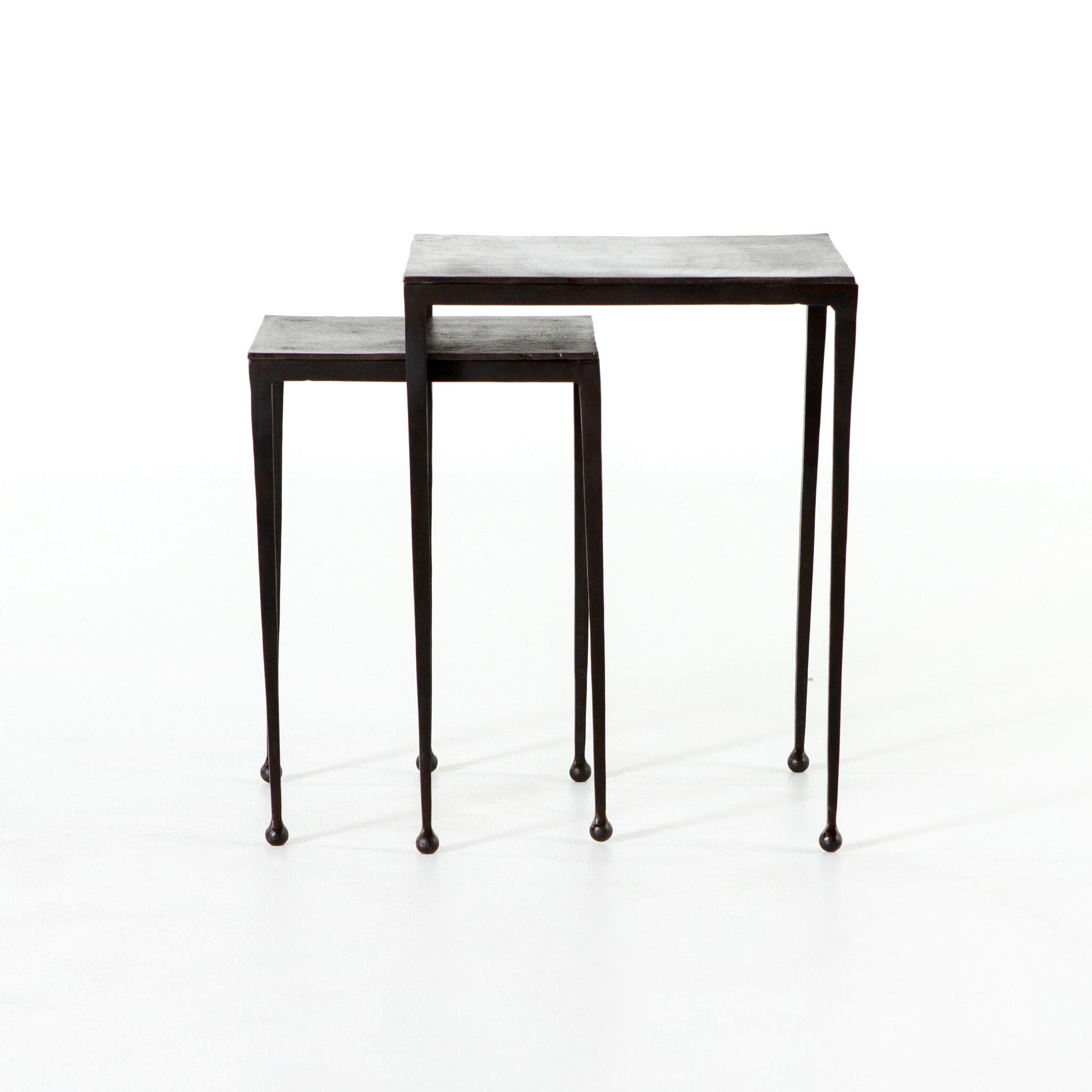 Slender styling adopts depth from swirls of antique tones. Tapered legs with rounded feet bring balanced footing to streamlined shaping. Aluminum tops are squared-off and finished in a rich rust.