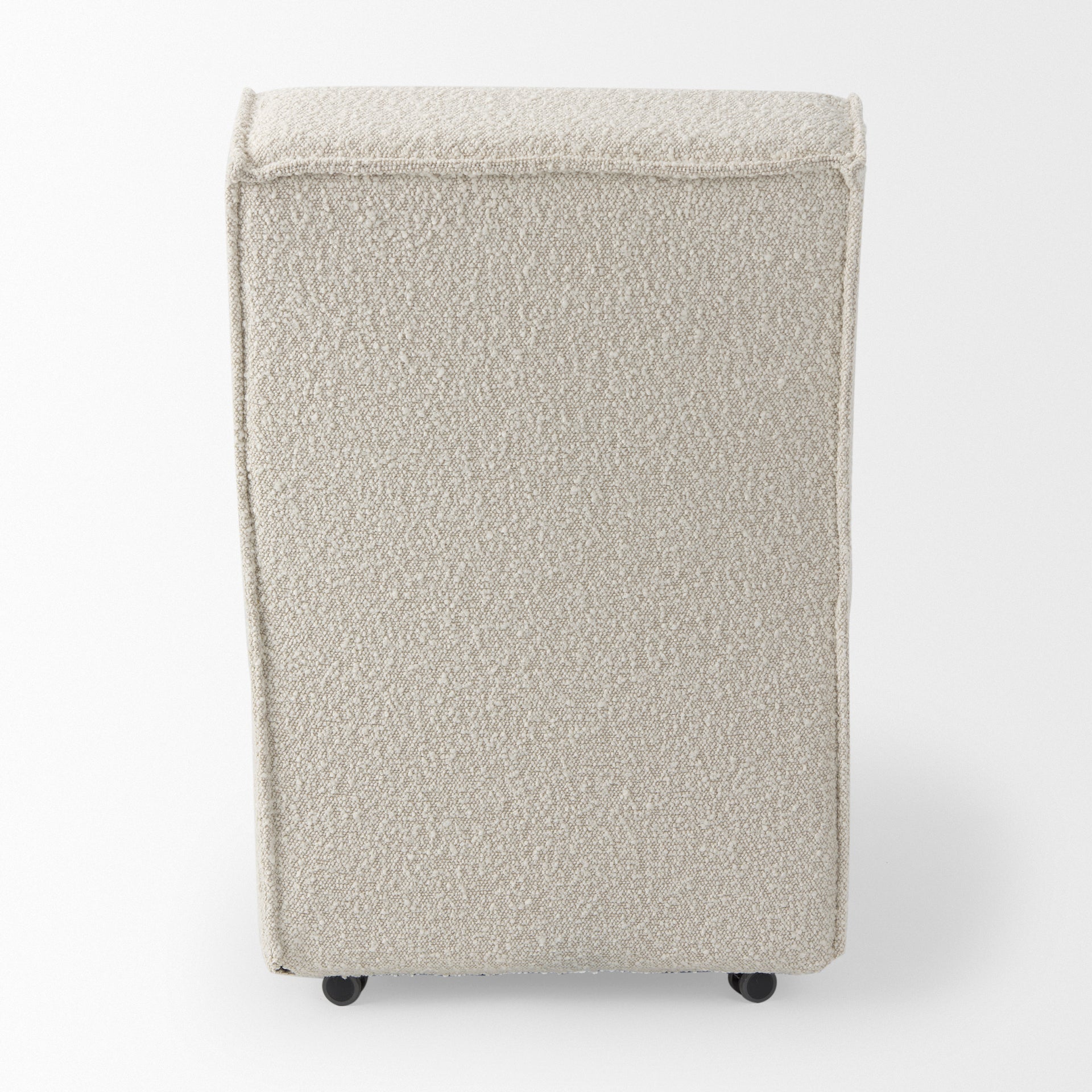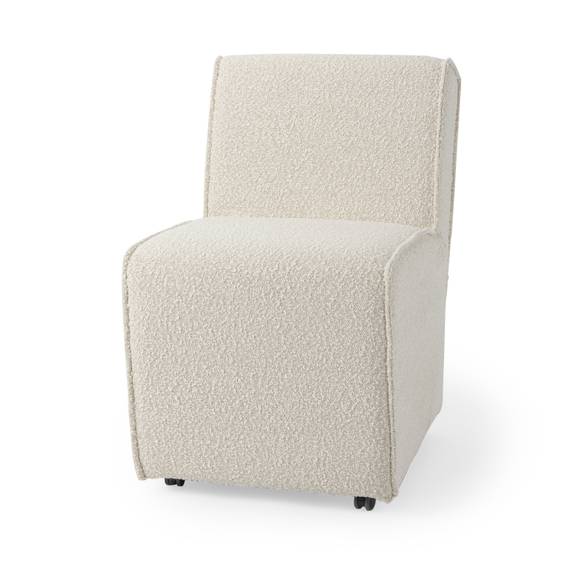 The Declan is a beautiful dining chair that features a Beechwood frame with a perfectly cushioned, seat and backrest. What makes the Declan dining chair stand out is the plush, cream-toned fabric that not only covers the seat and backrest but also extends to cover the base. The fabric covering hides most of the wooden accents on the chair, making it look like an all fabric piece. In addition to this, the chairs are also equipped with four wheels for mobility.