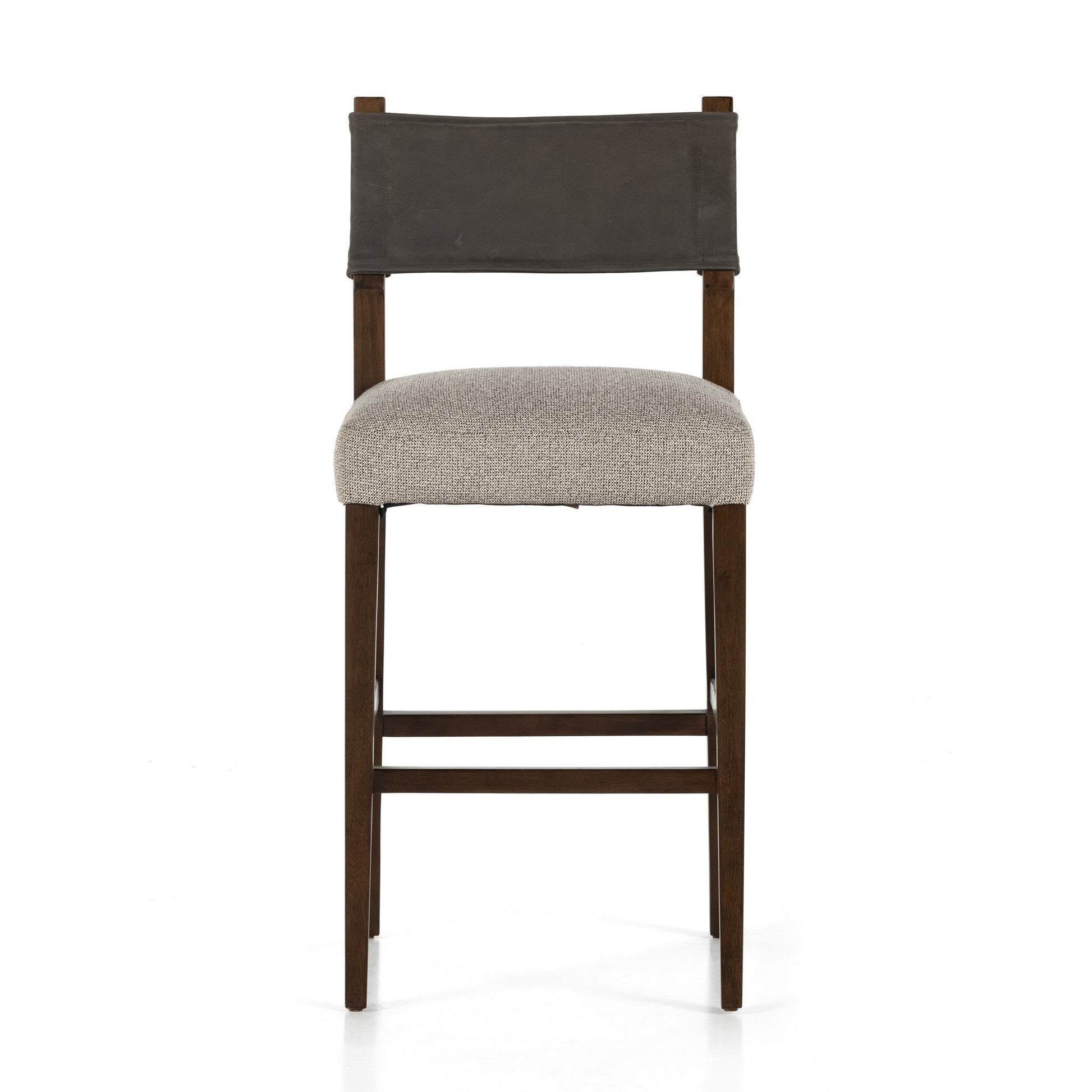 Perfectly sized for the bar or counter, burnished parawood frames squared seating of high-performance fabric, with top-grain leather backing. Performance fabrics are specially created to withstand spills, stains, high traffic and wear, ensuring long-term comfort and unmatched durability.