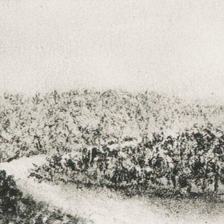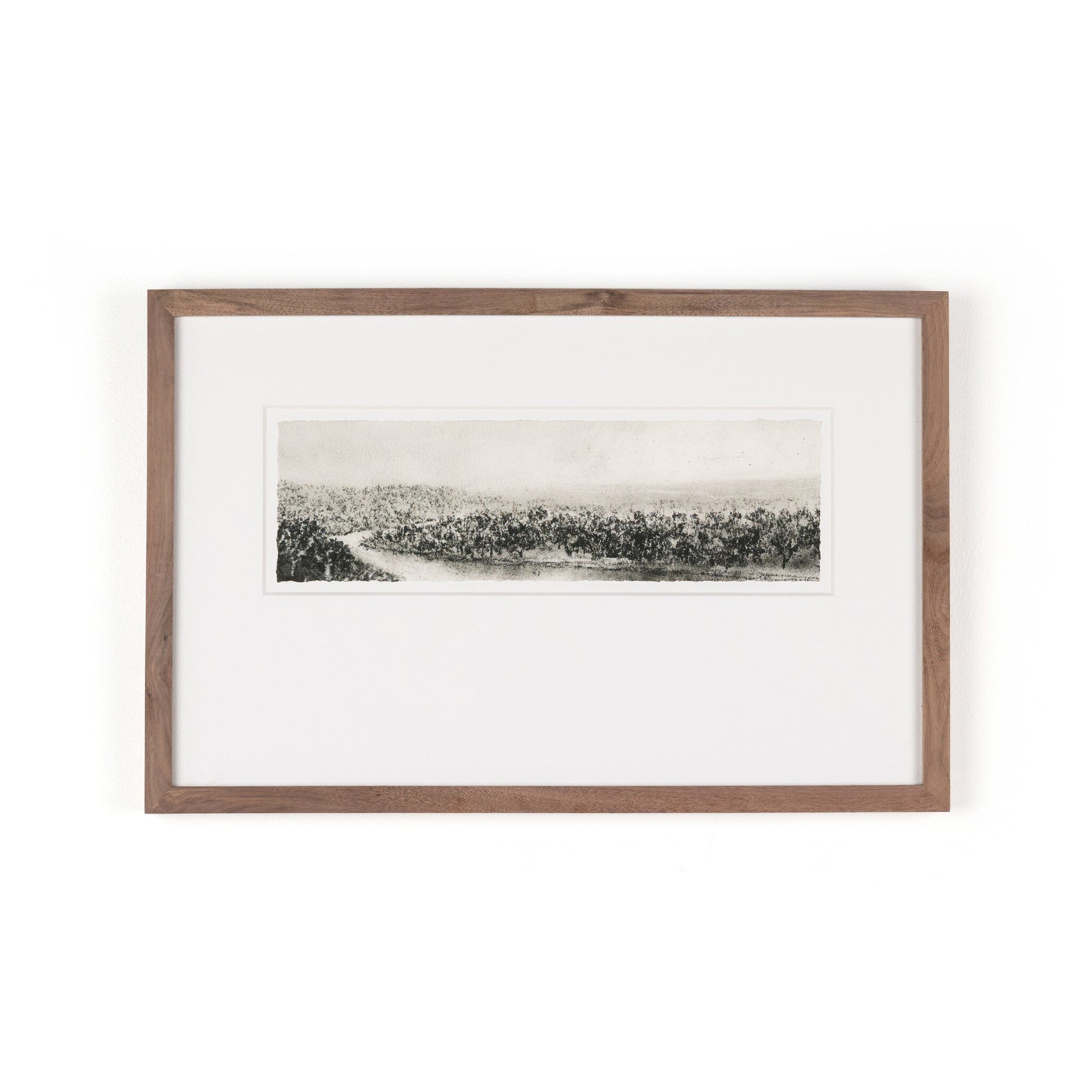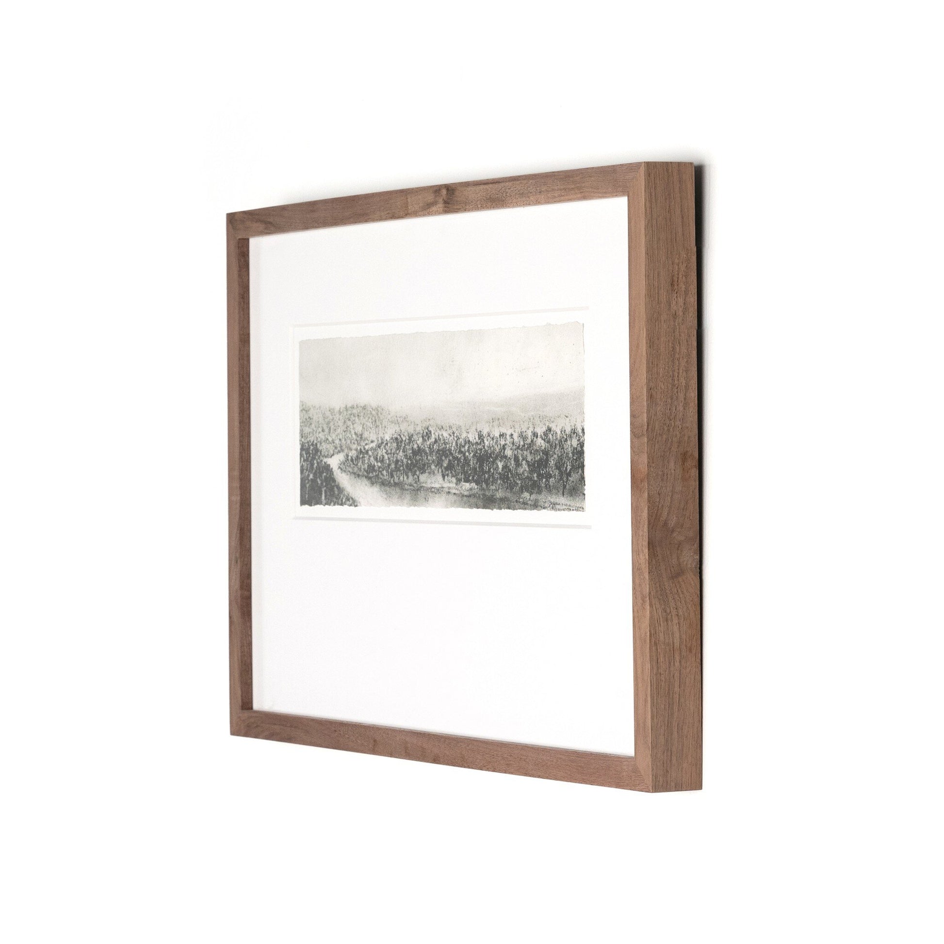 Charcoal drawing framed with walnut for a museum-quality look, the detail of this piece stands out. A bottom-weighted matte and floating within the matte offer additional dimension. Austin-based artist and registered nurse Aileen Fitzgerald paints atmospheric landscapes reminiscent of early Impressionism with a heavy emphasis on light. Handmade in Austin, Texas.