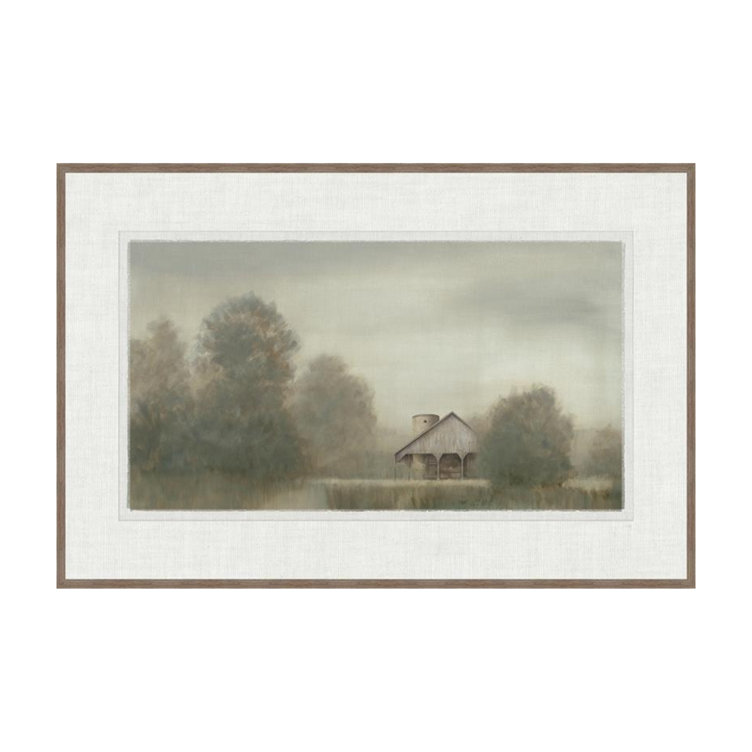 Soft and quietly nostalgic, the Lilt I Artwork captures a peaceful rural scene through gentle layers of muted greens, warm neutrals, and atmospheric haze. A small barn rests within the landscape, adding a subtle focal point while maintaining the artwork’s calm, understated mood. The glass frame finish gives the piece a clean, refined presentation that enhances its delicate details and depth.