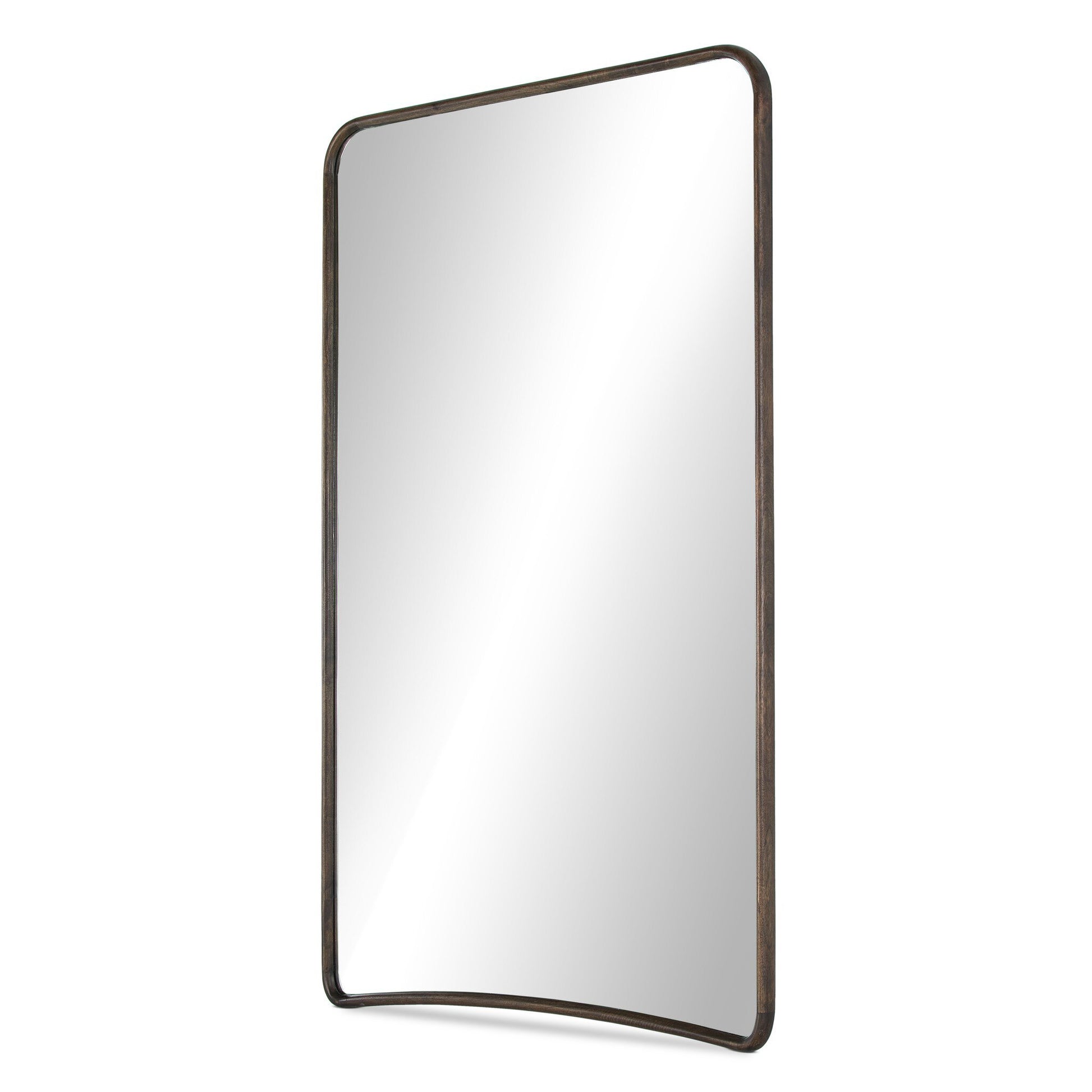 A modern take on Deco. A simple-but-beautiful floor-length mirror of aged brown mango features bullnose edges and a graceful lower arch.