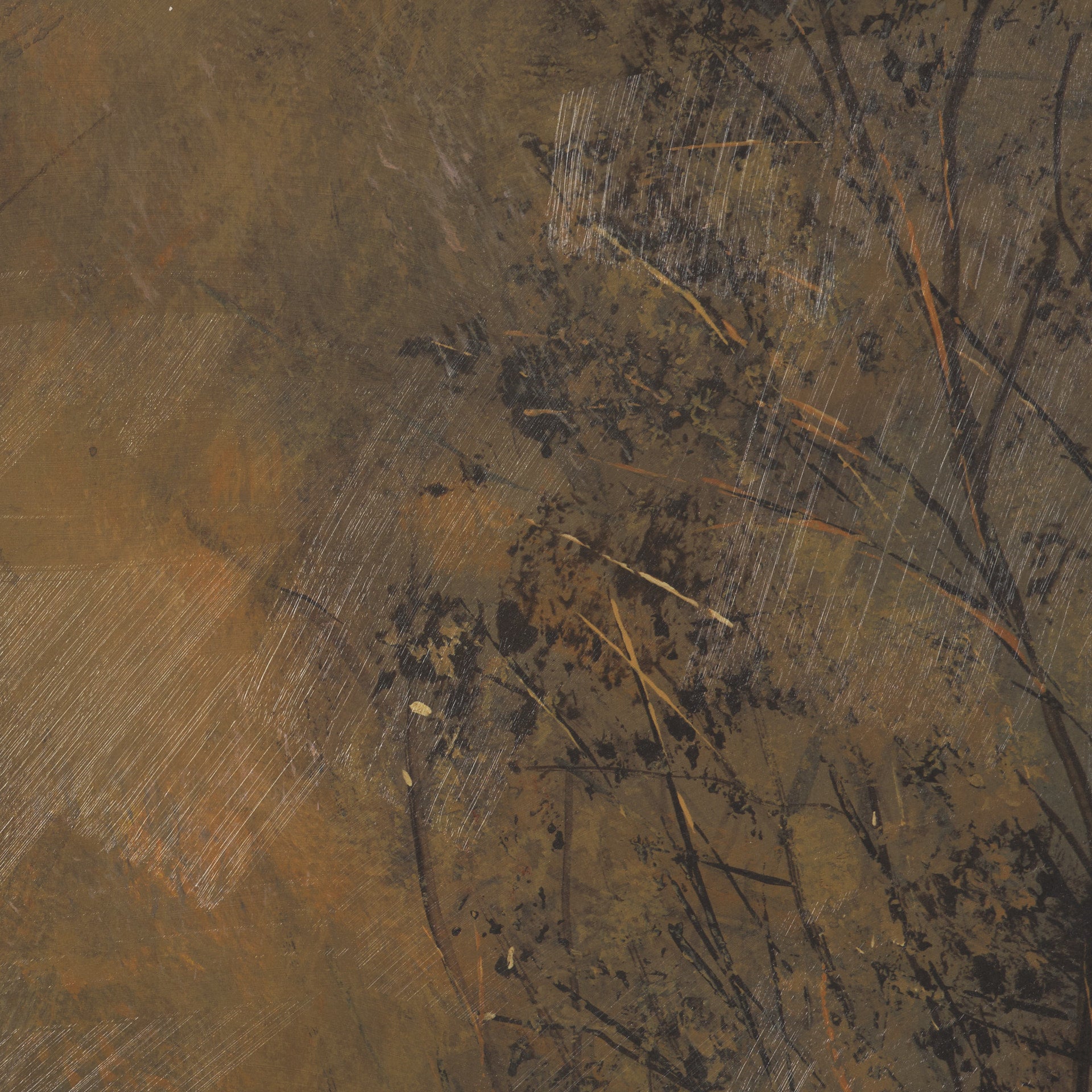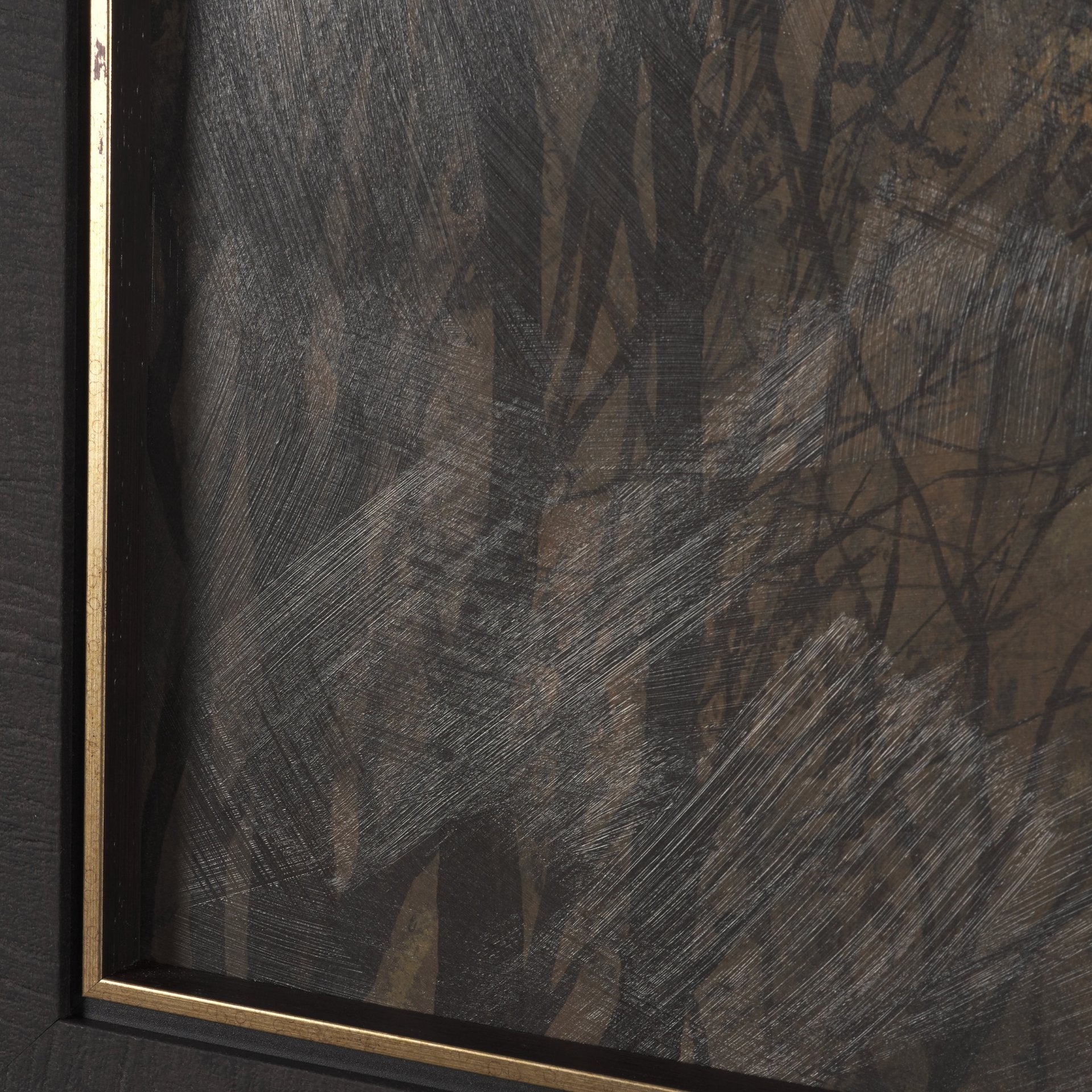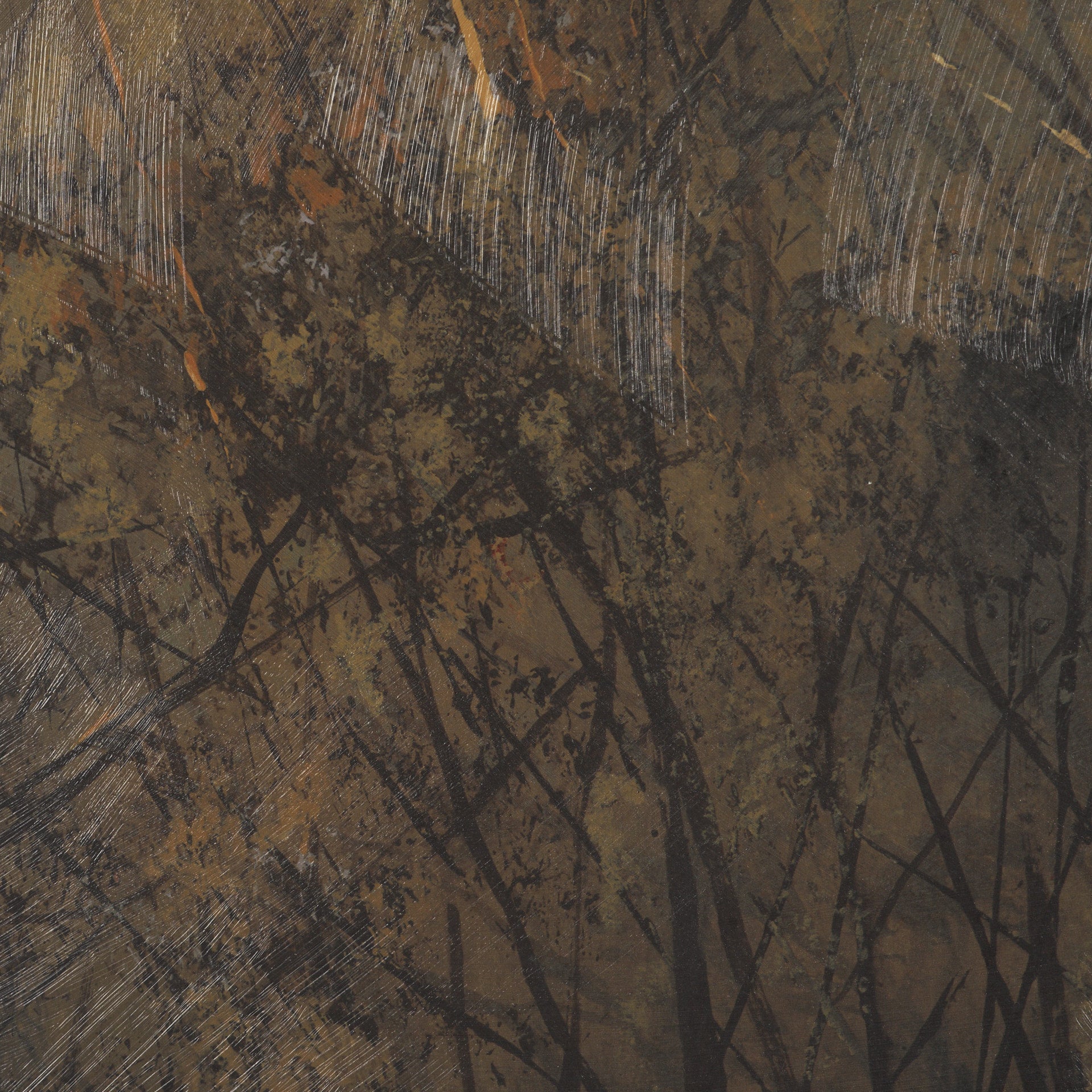 Night Sky I is a mixed media artwork that captures the quiet beauty of nature through intertwining branches set against rich, earthy tones. A muted palette of browns and greys evokes an autumnal calm, while hand-embellished details add layered texture and depth. Framed to enhance its presence, the piece invites a sense of stillness and contemplation.