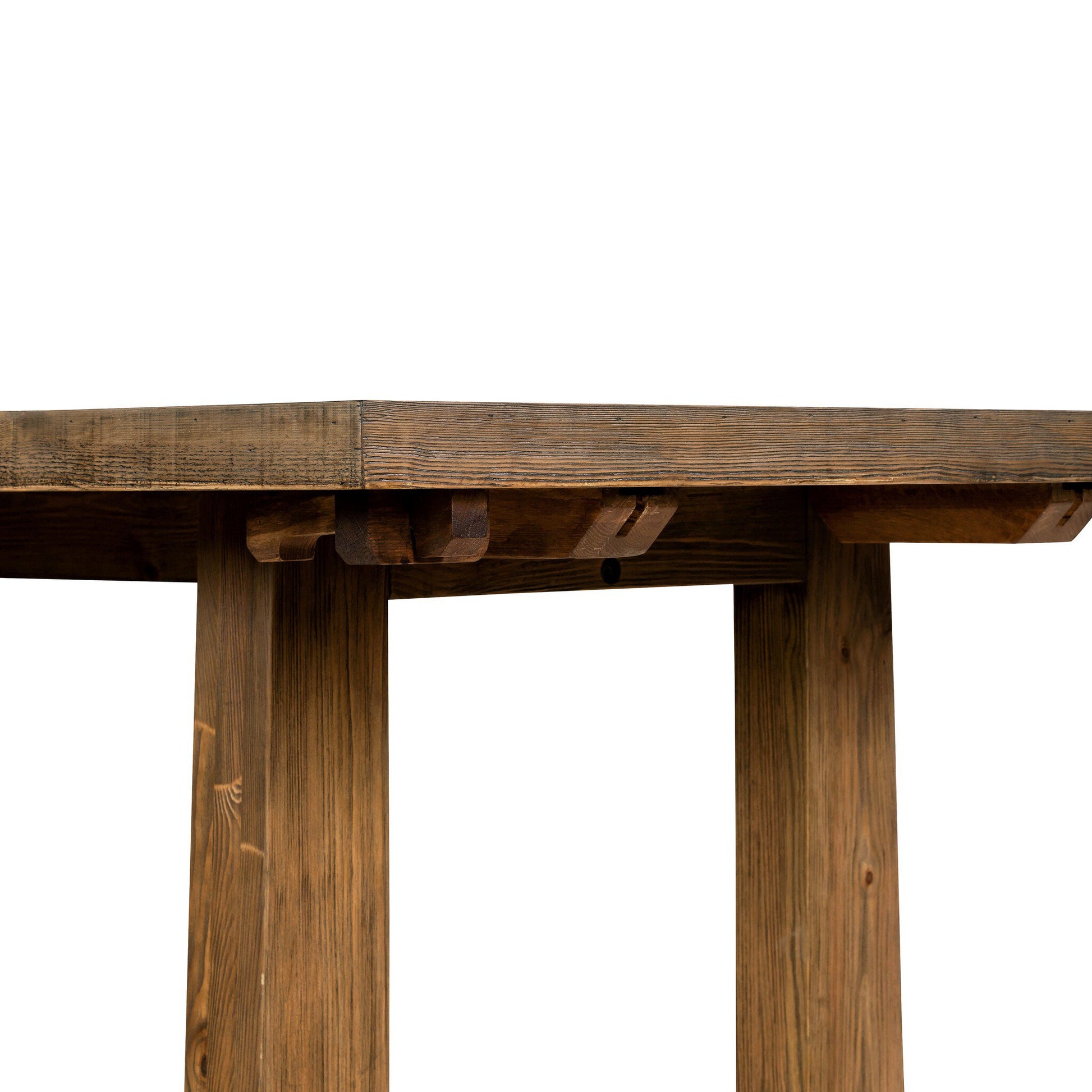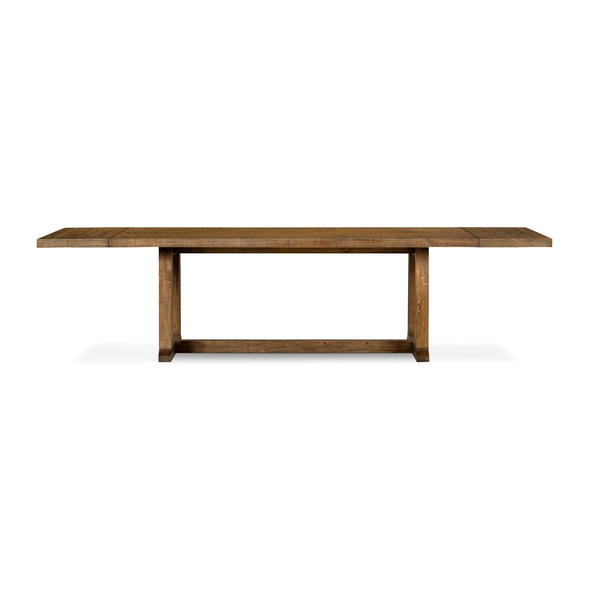 Bring a traditional sense to the table. Finished in a warm honey, a trestle base of solid pine supports a rectangular pine top, waxed and bleached for a rustic look. Two slide-in bread boards create more room at the table for guests, expanding from 86" to 120".
