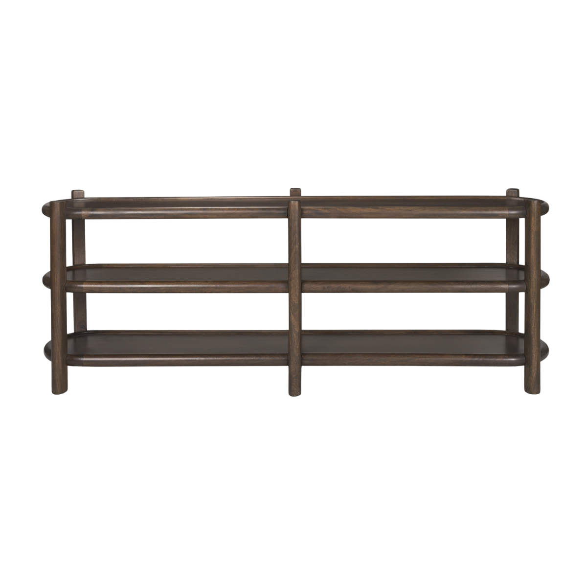 The Remi Console Table is crafted from mango wood and finished in a rich, dark brown stain. A curved rim carved from solid mango wood surrounds the oval tabletop and bottom shelves, adding complementary detailing to the otherwise classic design. Its three-tiered structure provides ample surface area for displaying decor, while the rounded legs add a subtle touch of refinement.