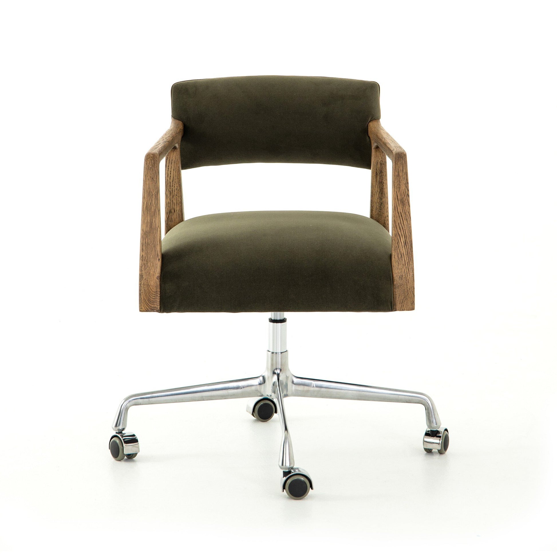 An angular, distressed oak frame supports a deep seat and striking low-slung back for a bold yet refined profile. Upholstered in olive or traditional ivory fabric featuring a classic box pattern. Metal casters allow for easy mobility in the workplace. Height is not adjustable.