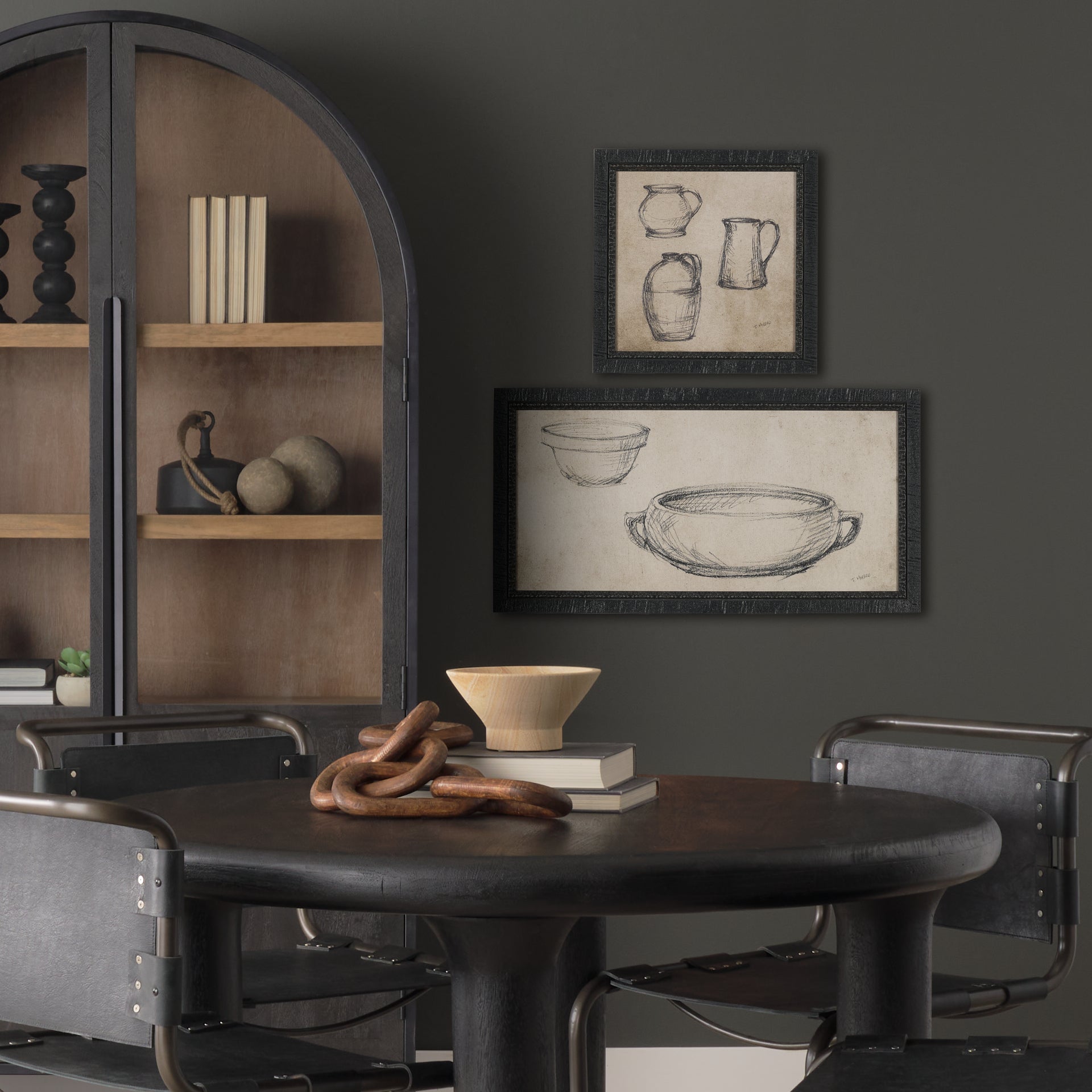 "Vintage Tableware Sketch (Set of 2)" is a stunning diptych capturing the timeless allure of classical pottery through deft charcoal sketches. These hand-embellished pieces present an exquisite study of form and texture, with gentle contrasts against a soft, sepia-toned background. Set within a sophisticated, rustic black frame, each artwork is matted under glass.