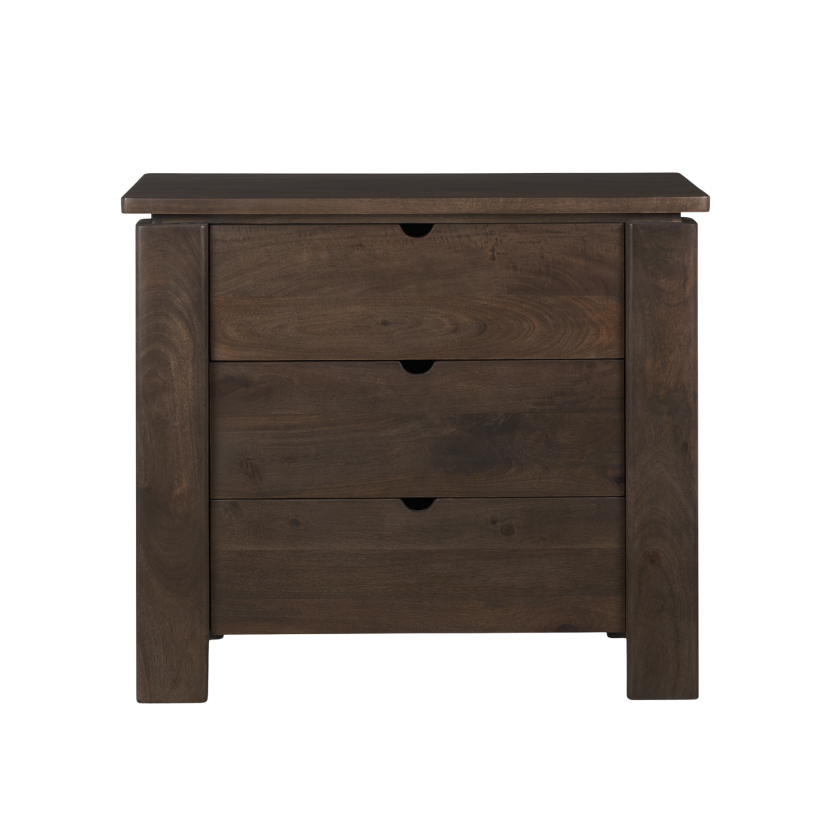 The Warren Accent Cabinet, expertly crafted from solid medium brown wood, is a modern take on a classic design. Its robust build showcases a raised tabletop, three drawers fastened with dovetail joints and cut out handles, and legs with rounded edges. Offering a timeless aesthetic and generous storage capacity, the Warren Accent Cabinet is a versatile piece perfect for any setting.