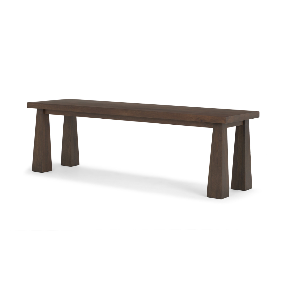 Winslow is a solid mango wood rectangular bench with four angular legs, all finished in a rich dark brown.